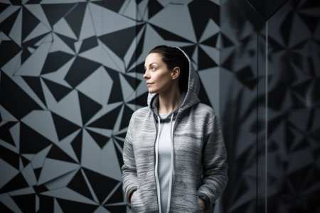 Attractive young woman in hoodie standing against black background with geometric pattern