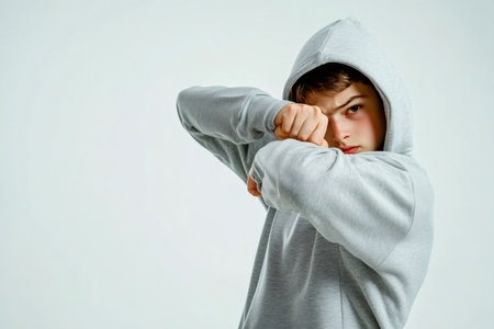 Teenage boy wearing a gray hoodie, looking with a serious expression, arms crossed defensively in front of his face