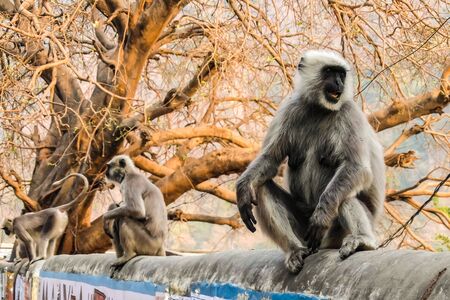 Indian Gray langur hanuman monkeys troops resting on mountain