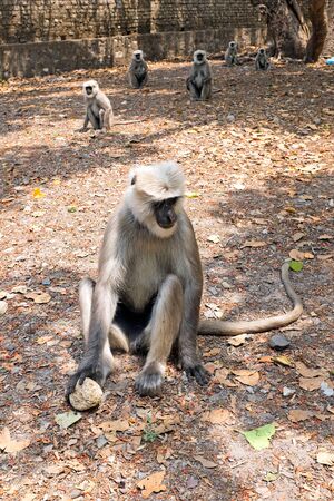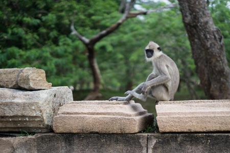 Monkey families - purple-face langur - in the pilgrimage site of the old royal city Anuradhapura on the tropical island Sri Lanka