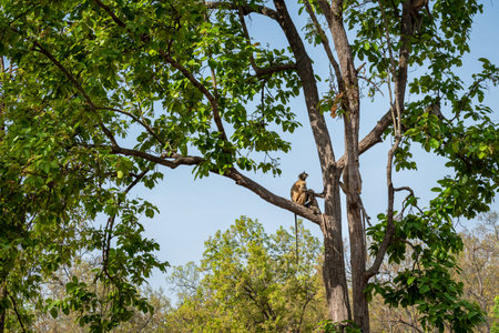 Gray langur, sacred langur, Indian langur or Hanuman langur, Old World monkey perched on a dead tree trunk with a beautiful sal tree background at Bandhavgarh National park, madhya pradesh, india