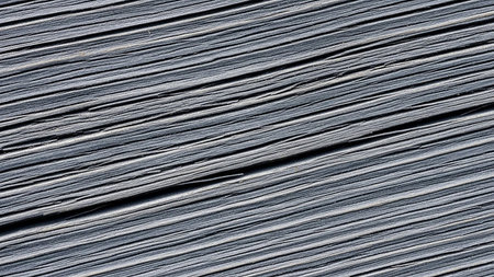 A detailed macro view of stacked gray paper or cardboard, revealing fine horizontal lines and subtle crinkles arranged in a diagonal pattern.