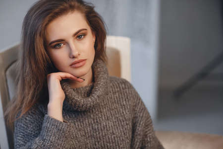 Beautiful sexy girl in an elegant gray sweater. Close-up, portrait of a beautiful woman, model, indoors. An elegant woman sits alone in a room. Attractive lady in knitted sweater posing alone, sitting in armchair at home in the room