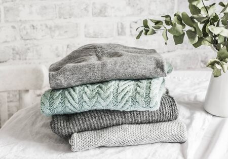 Stack of cozy winter autumn sweaters pullovers on the table on a light background