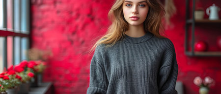 Cozy warm sweater worn by a model in a modern indoor setting, emphasizing comfort and style with muted tones Perfect for seasonal fashion themes