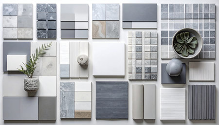 Discover a modern minimalist tile arrangement featuring a clean surface and neutral tones, ideal for interior design and home renovation inspirations and projects.