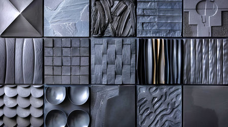 Monochromatic Geometric Textures and Patterns in Creative Abstract Composition A digital collage of various materials shapes and architectural elements in a minimalist modern