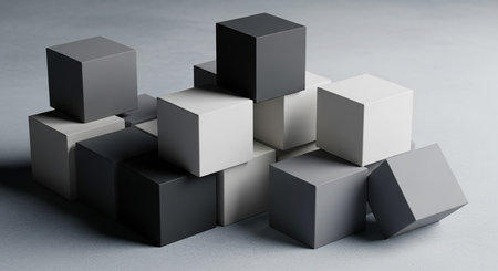 A pile of gray and white cubes stacked in an abstract arrangement on a textured surface.