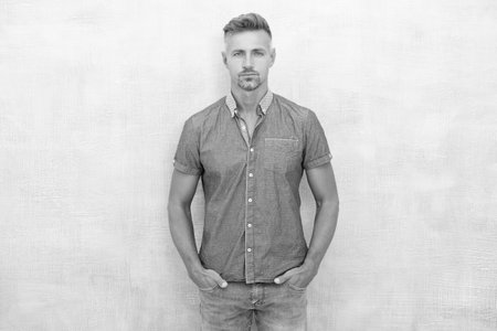 Detailed photo of charismatic brunette male with buzz cut hairstyle standing centered against uneven, monochromatic light gray backdrop.