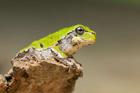 Gray Tree Frog (Hyla versicolor) on a tree with a green background