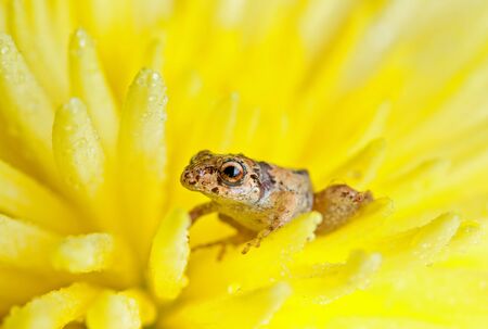 Little european tree frog, hyla arborea, sitting in flower head in summer nature. Close-up of wet amphibian with dominant eye resting on wildflower. Wild animal in wilderness.