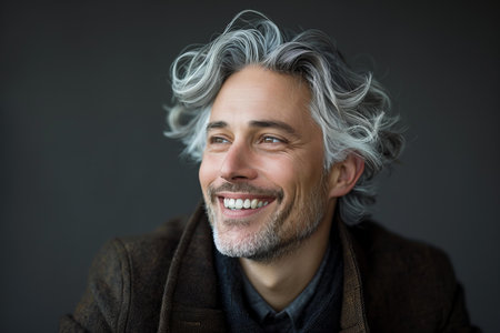 A middle-aged man with silver-streaked hair beams with a genuine smile while wearing a cozy, knitted sweater. He is positioned against a dark background, enhancing his cheerful demeanor.