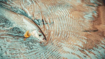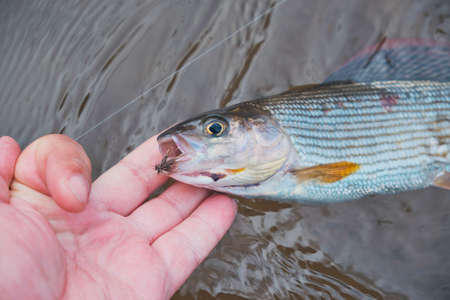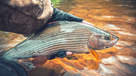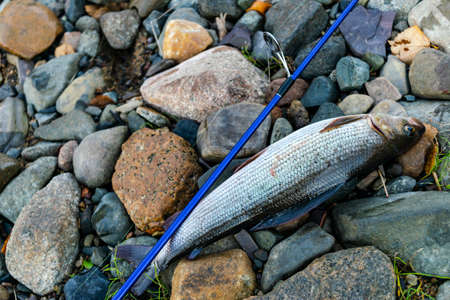 Grayling caught fly fishing tackle. Angler releasing an arctic grayling. Grayling fish caught on the spinner by fisherman. Northern fishing. Successful fishing concept. Fishing tackle spinning rod on river stones