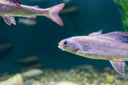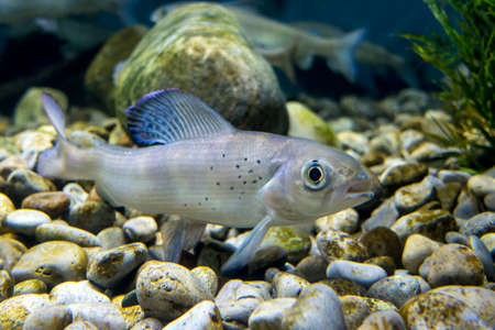 Small juvenile freshwater fish swimming underwater among stones in clear water, close up view of young cyprinid fish in natural river habitat