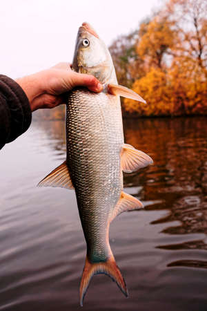 Asp caught on spinning during the autumn time. Fish is lying on a background of grass with hoarfrost and yellow autumn leaves.