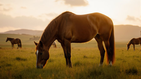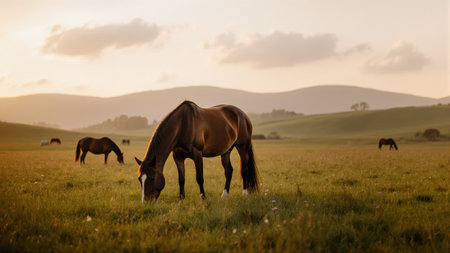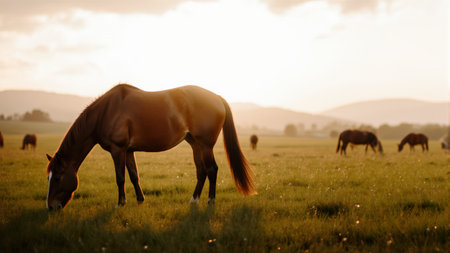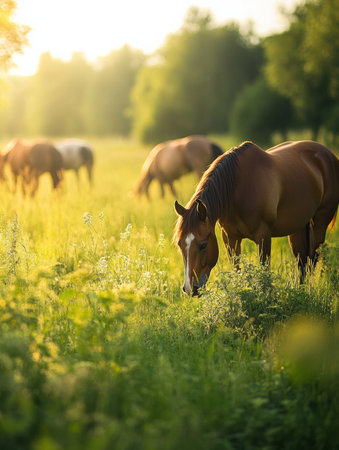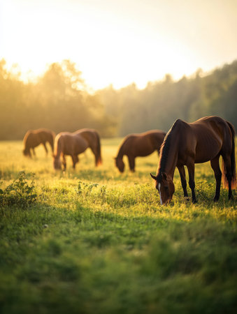 Horses graze peacefully in a vibrant green pasture illuminated by warm golden sunlight, surrounded by a soft blurred background of nature during evening hours.