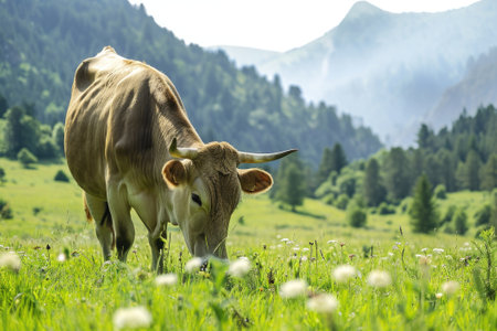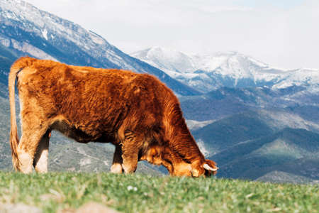 Brown cow grazing on a green meadow in the Pyrenees