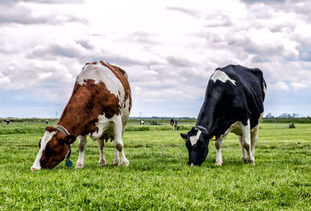 Grazing cattle in pasture along the waterfront in a dutch polder landscape