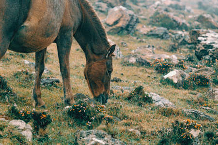 A horse stands in the mountains, field, nature, animals, livestock.