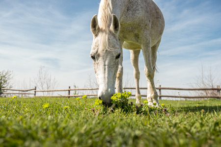 Gracious white and gray horse grazing in the field at sunrise on a summer day