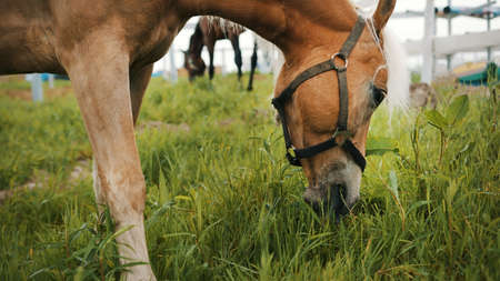 A flaxen horse grazing in the beautiful field meadows. A light brown horse with a blonde mane eating grass on the horse farm. Lush greenery in the background. Scene from the horse farm.