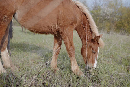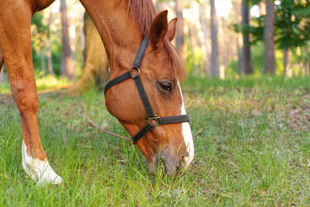 Horse eating grass in the local park, close-up.