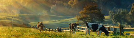 Cows grazing in a meadow at sunrise in the countryside.