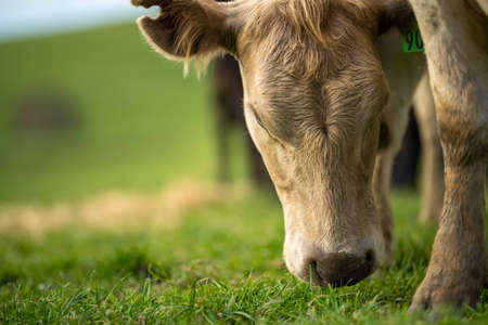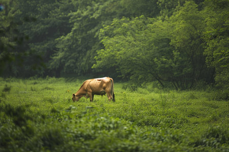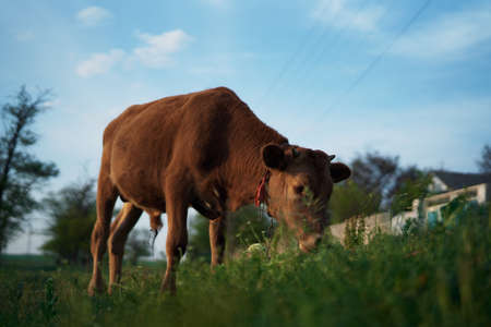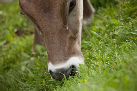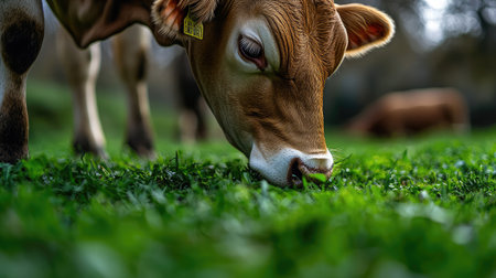 Close-up of a brown cow munching on fresh green grass in a quiet rural meadow