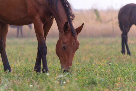 A beautiful brown horse grazing on a sunny meadow