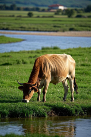 black cow eating grass in the meadow near the river