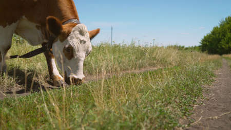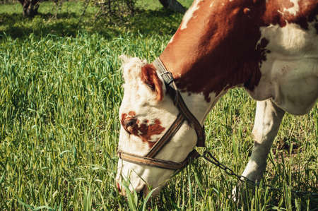 White cow with brown spots close up grazes in the garden and eats green grass