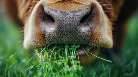 A close-up of a cow's mouth chewing fresh grass, with tiny details of its tongue, teeth, and saliva captured in sharp focus.
