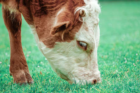 Hereford Cow Grazing with head down while facing left . Pictured from shoulders down