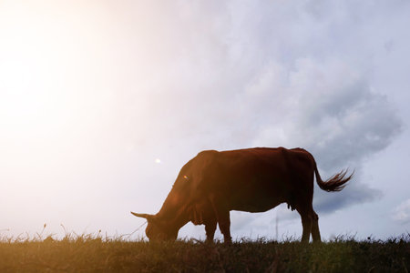 cow silhouette in the meadow with sunset background