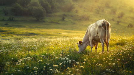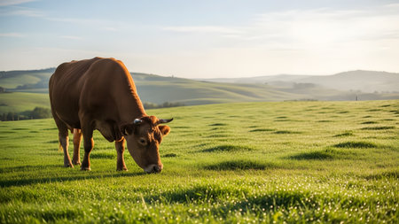 A brown cow grazes in a lush green pasture with rolling hills in the background. The peaceful rural landscape is bathed in soft sunlight, highlighting the healthy livestock and the expansive agricultural setting.