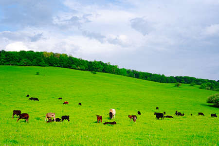 Herd of cows grazing in the middle of the field in summer.