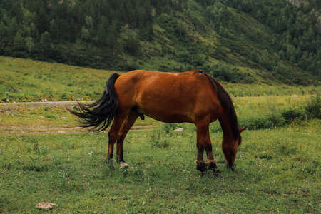 Horse grazing on a meadow in the Altai Mountains.