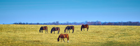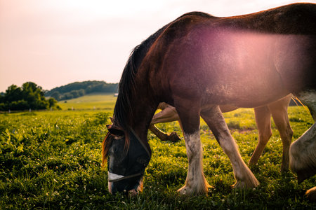 A peaceful scene with horses grazing. The soft light and beautiful bokeh make this a high-quality stock photo