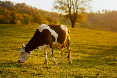 cow walks around and eats and a beautiful sunrise in the background. farming lifestyle.