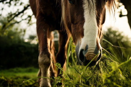 Grazing Serenity: A Horses Indulgence in Lush Green Grass