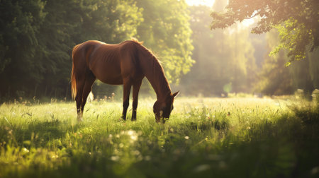Serene image of brown horse grazing in sunlit field surrounded by trees