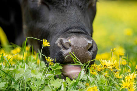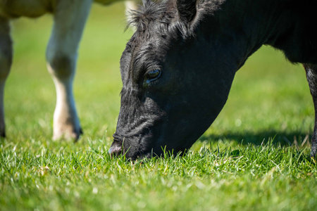 Stud Angus, wagyu, Murray grey, Dairy and beef Cows and Bulls grazing on grass and pasuture. The animals are organic and free range, being grown on an agricultural farm in Australia.