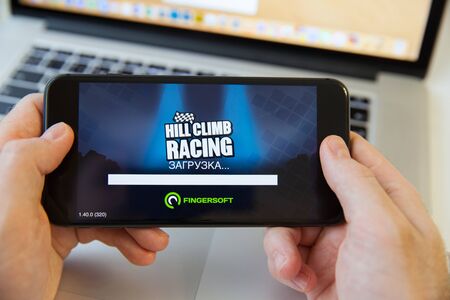 Moscow / Russia - February 20, 2019: holding an iPhone on MacBook background. hill climb racing is loading