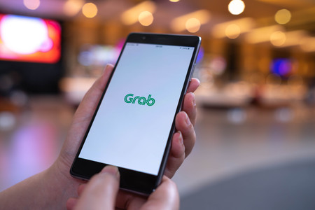 CHIANG MAI,THAILAND - JAN 18,2017 : A MAN hand holding Grab app showing on iphone 6s with computer laptop and ear podon wood desk in coffee shop. Grab is smartphone app-based transportation network