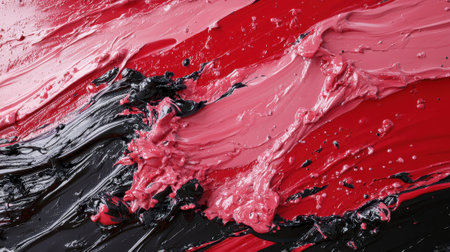 Vivid strokes of red, black, and pink paint blend and clash on a textured canvas, creating a dynamic visual experience reminiscent of abstract expressionism.