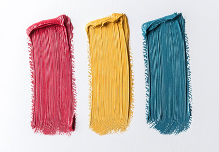 Close-up of three vibrant paint strokes in red, yellow, and teal on a white background