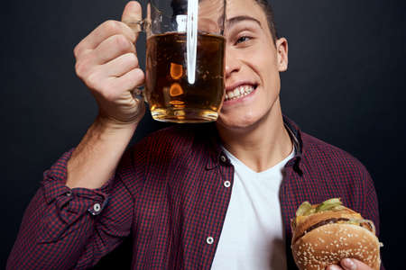man with beer mug and hamburger in hands fun lifestyle studio dark isolated background