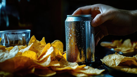 A hand gripping a soda can with condensation, placed on a table surrounded by chips and snacks.