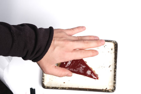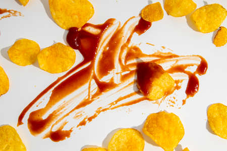 Kutchut is smeared and potato chips are scattered on a white background. Top view, flat lay.