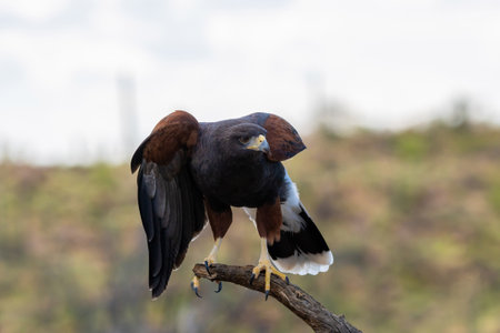The Harris's hawk, Parabuteo unicinctus formerly known as the bay-winged hawk or dusky hawk, is a medium-large bird of prey